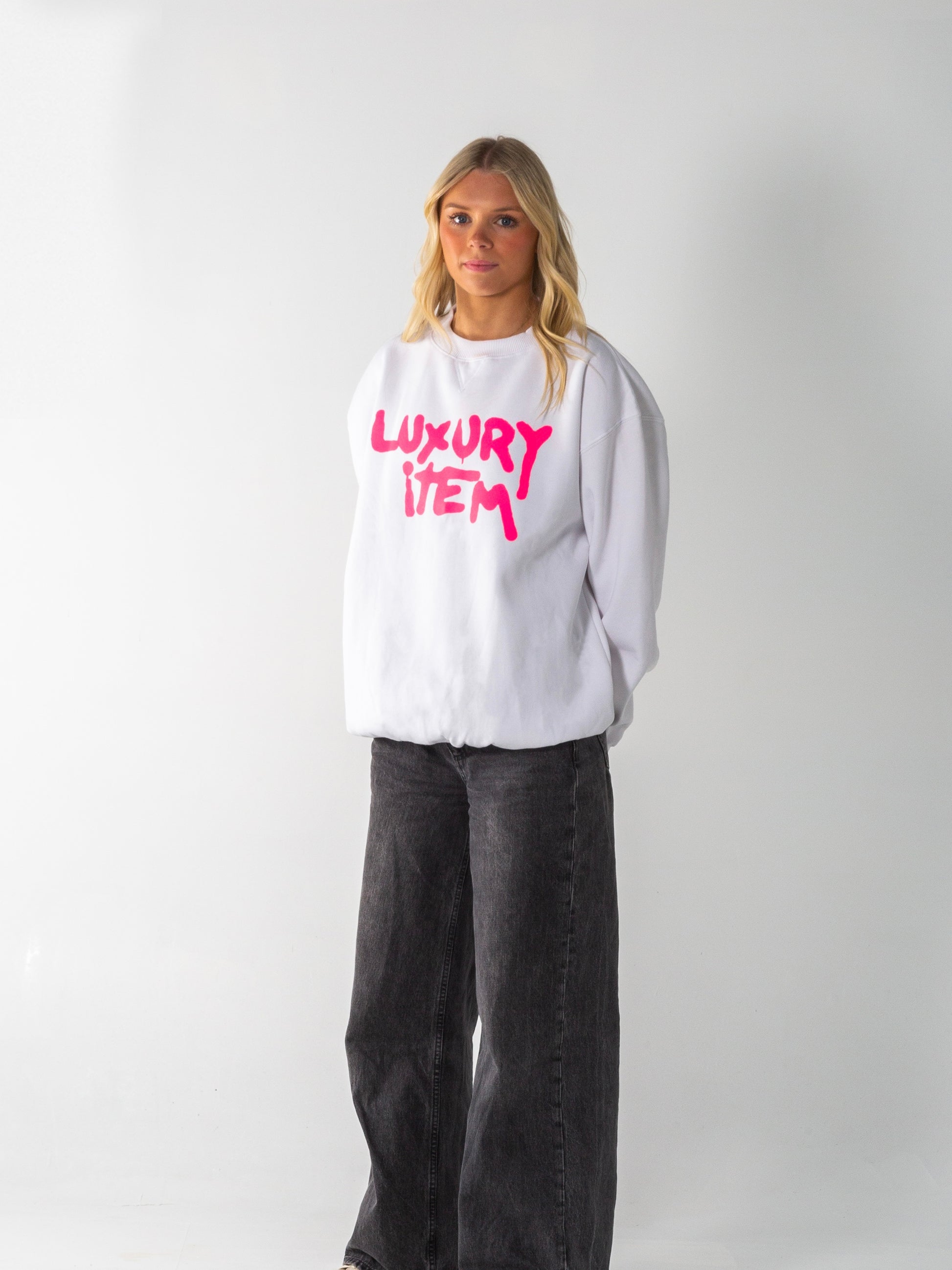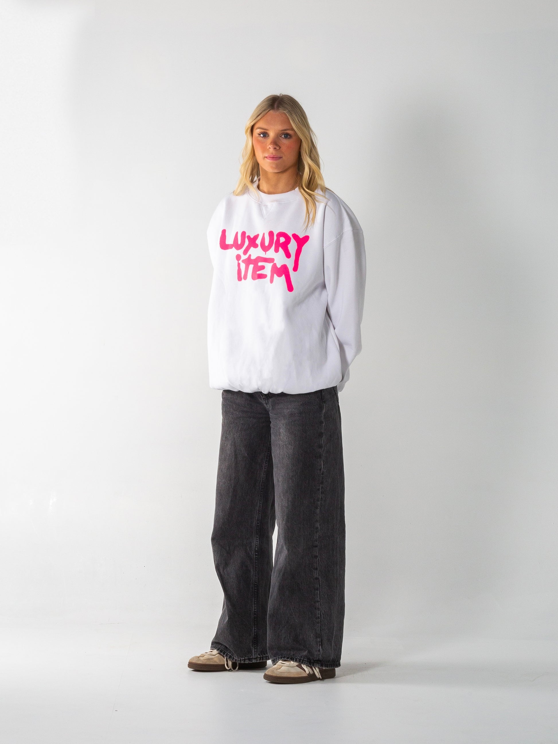 Make a statement without saying a word. The Luxury Item Graphic Crewneck is made for those who lead with confidence and dress with purpose. Featuring bold, hot pink graffiti-style lettering across premium white fabric, this sweatshirt is a cold-weather head-turner with all the attitude.